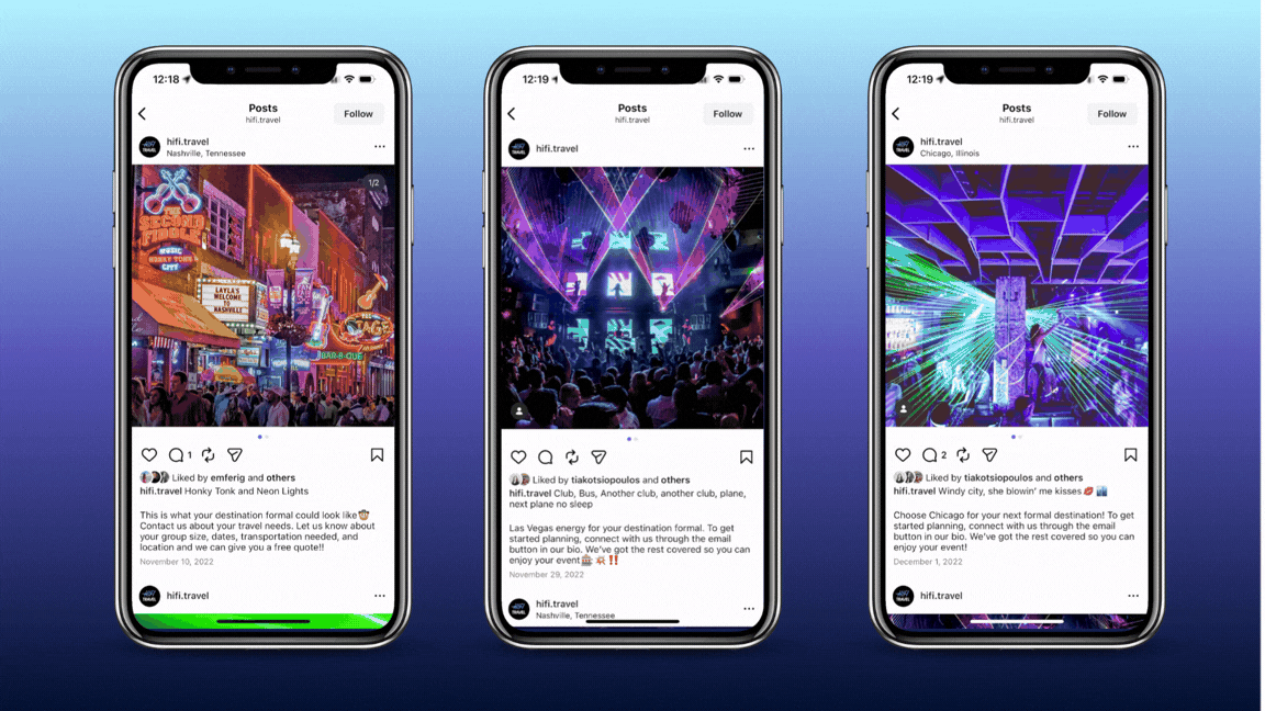 During my time at Hi-Fi Travel, I helped revamp the brand’s Instagram during a company rebrand, focusing on showcasing customizable group itineraries for college organizations. I created content highlighting top weekend destinations—Nashville, Chicago, and Toronto—while also developing concepts for future cities and larger group travel. The work emphasized Hi-Fi Travel’s ability to support everything from formal events to large class trips, positioning the brand as a flexible travel partner for student organizations.